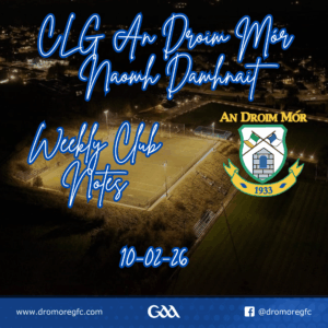 The Torthaí Lató (lotto winning numbers) for last week (4th) were 2, 6, 11, 12, 19 and 29 there were 13 winners with 4 correct numbers each. Next week’s jackpot in Ireland’s biggest club is £25,000, remember you can do the lotto via tickets in all local shops or online at www.dromoregfc.com.